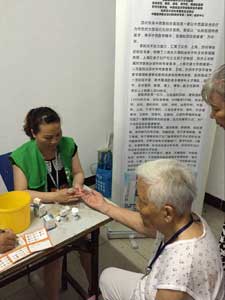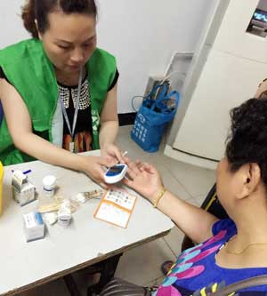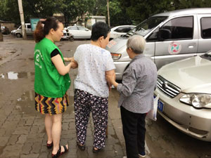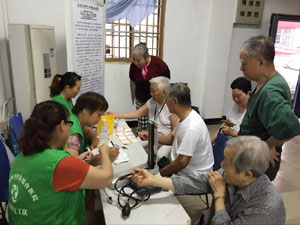 不多时,大雨已经慢慢转变为淅淅沥沥的小雨,兴隆桥社区的老人们也陆陆续续的来到义诊处。东吴义工队为老人们免费提供血压测量、血糖测试,并提供夏季养生保健知识讲解、健康咨询等义诊义检服务。